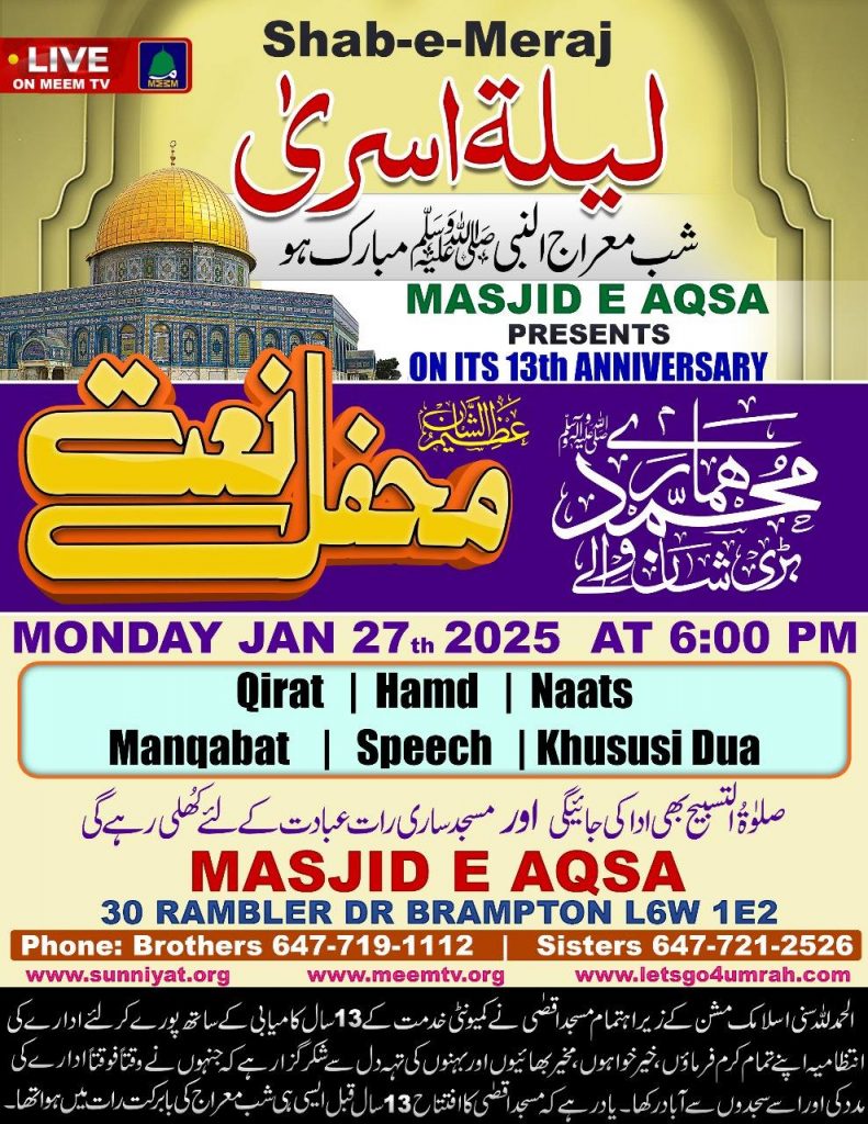 Universal Islamic Mission/ Masjid-E-Aqsa () is an organization which serves the community of the GTA. It is a part of the Ahlus Sunnah wal Jamaat. We strive to educate, motivate, and empower our youth and Muslim children to build a strong foundation and future for Islam in Canada for years to come. Alhamdullilah, a variety of religious, social, educational, and recreational activities, events, and services are provided at our Masjid/community centre and in the homes of our community members.